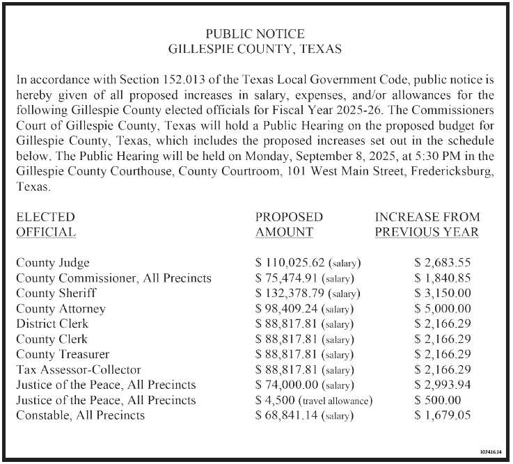 In accordance with Section 152.013 of the Texas Local Government Code, public notice is hereby given of all proposed increases in salary, expenses, and/or allowances for the following Gillespie County elected officials for Fiscal Year 2025-26. The Commissioners Court of Gillespie County, Texas will hold a Public Hearing on the proposed budget for Gillespie County, Texas, which includes the proposed increases set out in the schedule below. The Public Hearing will be held on Monday, September 8, 2025, at 5:30 PM in the Gillespie County Courthouse, County Courtroom, 101 West Main Street, Fredericksburg, Texas.